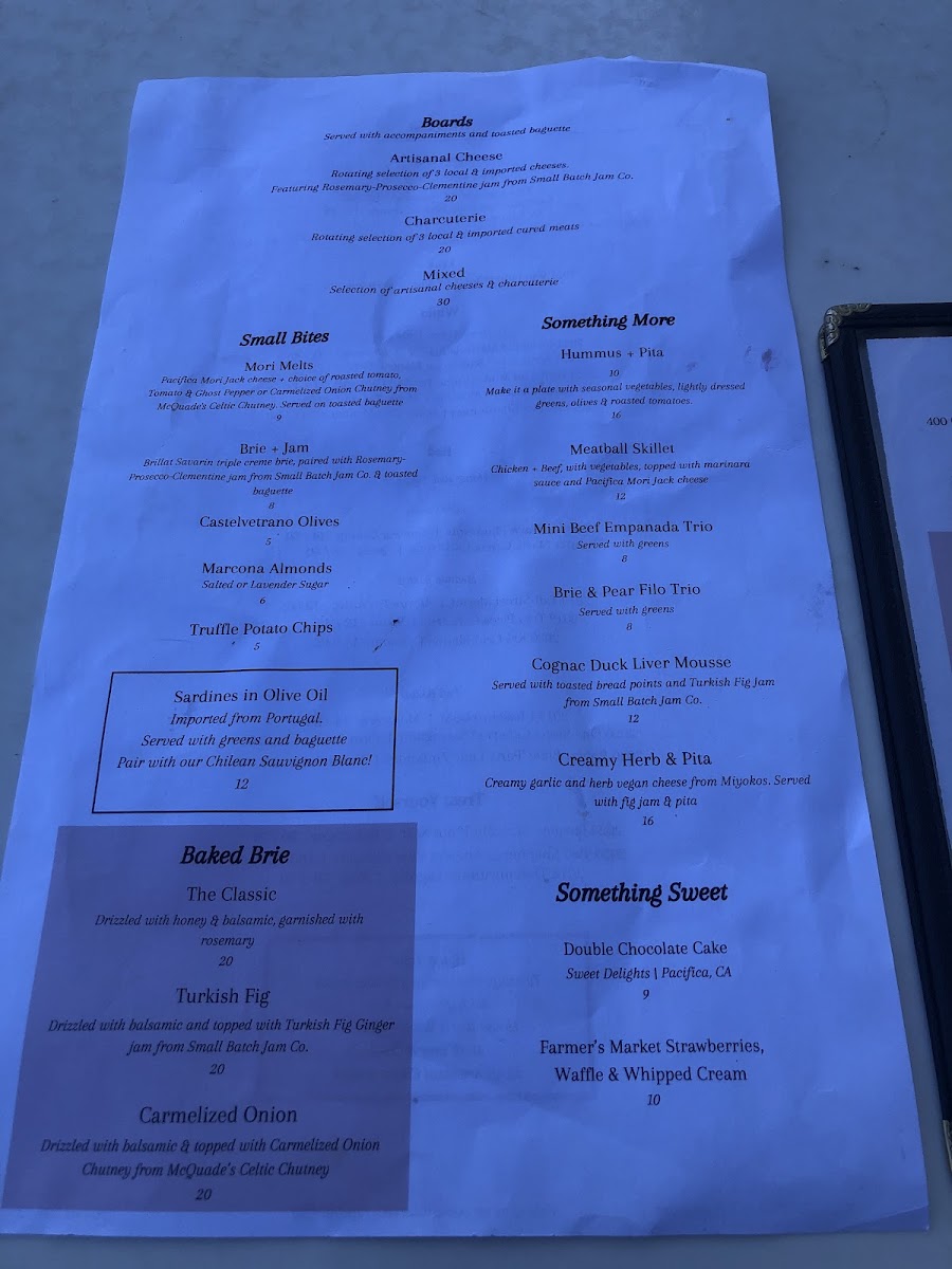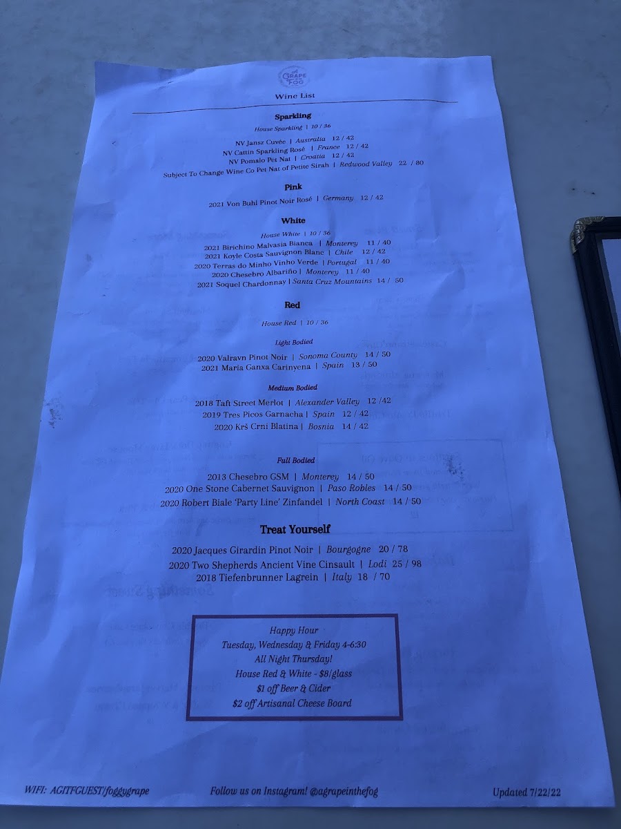 Welcome to A Grape in the Fog, a delightful wine bar located in the heart of Pacifica, CA. This charming spot offers a curated all-day menu featuring a selection of artisanal delights. Notably, the Charcuterie Box serves 2-3 and showcases an array of cured meats and cheeses, beautifully accompanied by garnishes and crackers for just $40. For larger gatherings, the Grand Charcuterie Box accommodates 5-7 guests and is available for $76.